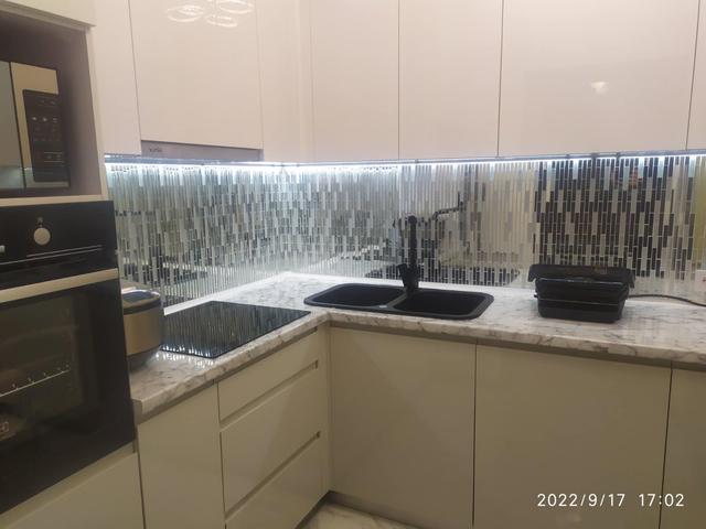 Один з трендів сучасного дизайну - використання дзеркальної мозаїки на робочій поверхні кухні. Глянцевий блиск дзеркальної поверхі чудово гармоніює з хромомованими деталями на побутовій техніці та сантехніці.